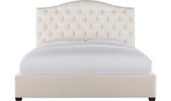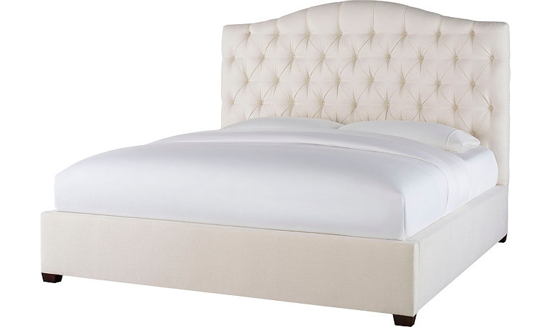 - Fully upholstered and tufted camelback headboard with fully upholstered footboard and side rails