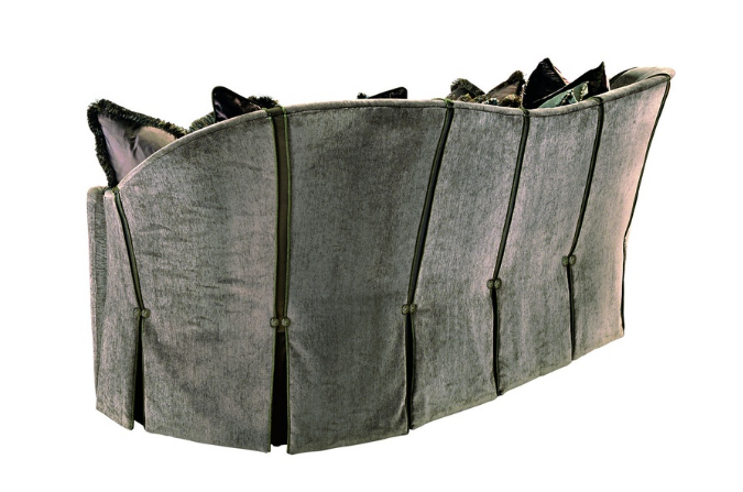 Built-to-the-floor with decorative panel inset, waterfall pleated skirt back with contrast inset panels, and decorative button detail
