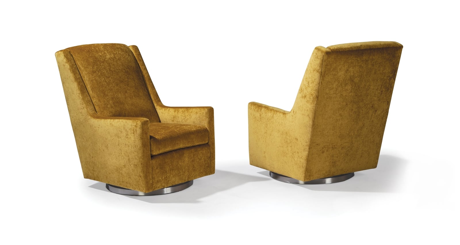 Originally designed by Milo Baughman in 1964, Clarence is a high-back, architectural lounge chair that exudes classic midcentury modern style. Refined and thoughtful, Clarence features a newly developed, semi-attached foam/trillium back and a luxurious poly blend down seat for maximum lounging comfort. The swivel base is available in brushed stainless or brushed bronze. Clarence is also available with a stationary maple wood base as No. 1441-103. Select from any of our in-house curated fabrics or leathers or provide COM for upholstery.