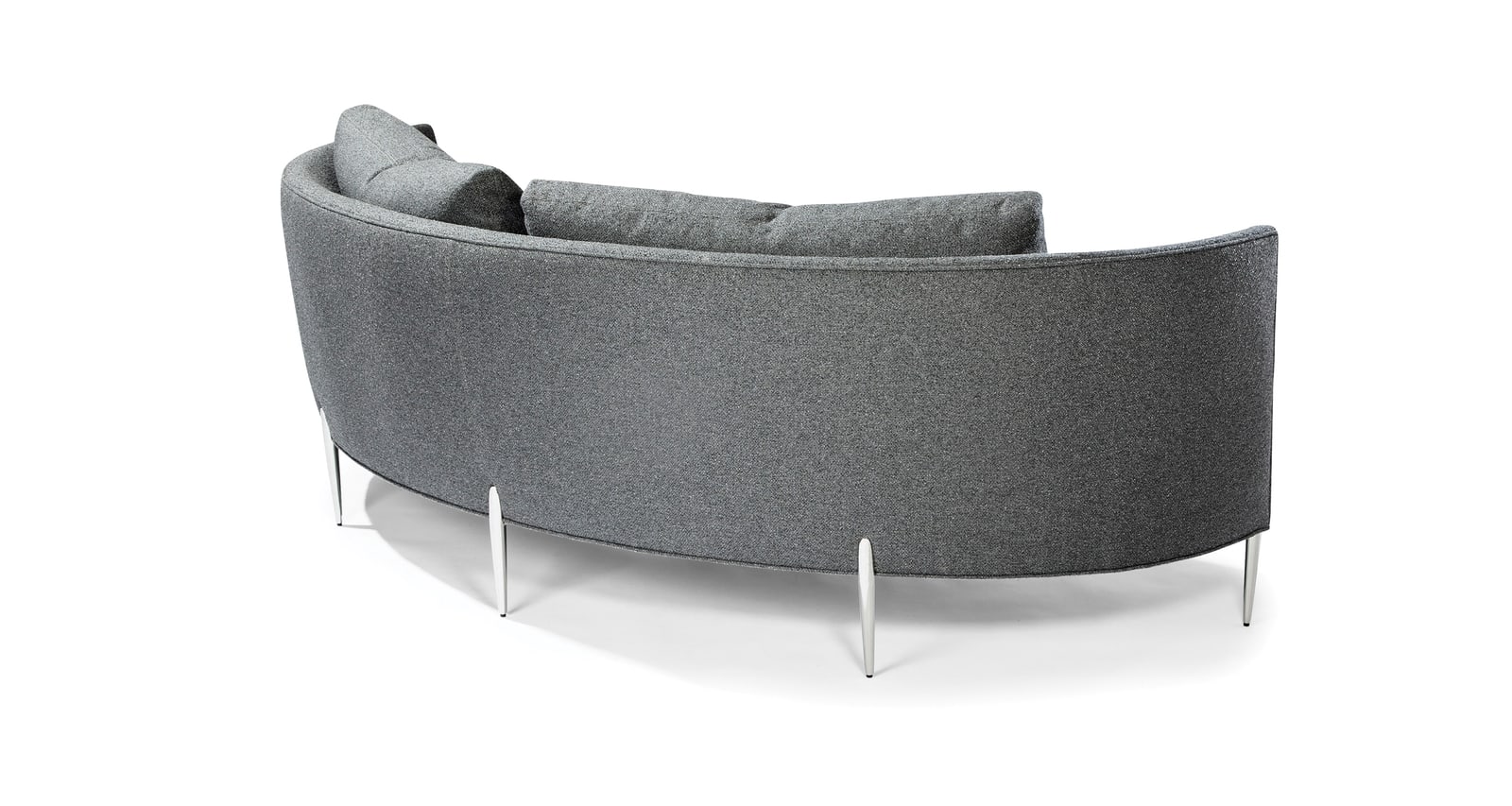 Designed by Ransom Culler, the Decked Out sofa is the epitome of curved comfort and elegance. Our Decked Out sofa comes standard with luxurious poly blend down bench seating and durable double-needle stitching. Companion lounge chairs are also available. Select from our many fabrics or leathers or provide COM. Decked Out is also available with satin brass legs as No. 1365-303-SB.