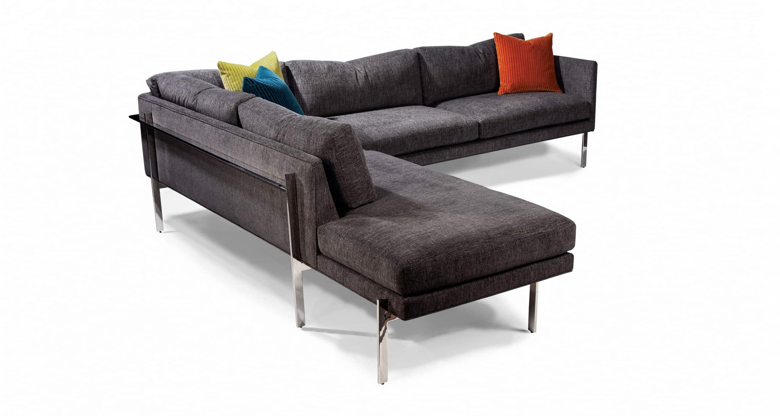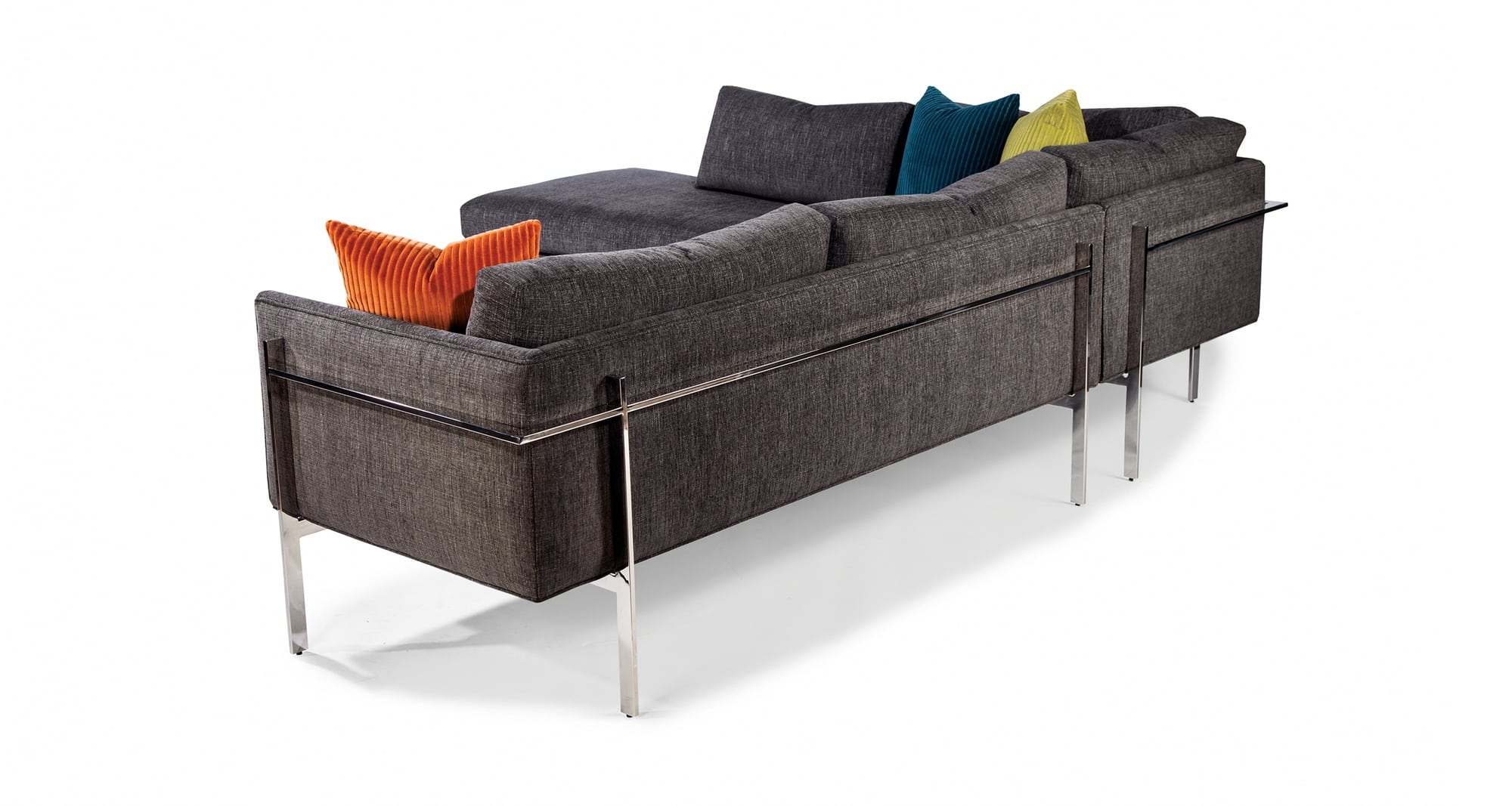 Our Drop In modular sectional sofa is a timeless and glamorous icon of the modern era. Customize your sectional by choosing from our six different modular units to create the perfect configuration. Select from any of our in-house curated fabrics or leathers for upholstery. Base and legs are polished stainless steel in finish. Also available with brushed bronze base and legs as No. 1314-B.