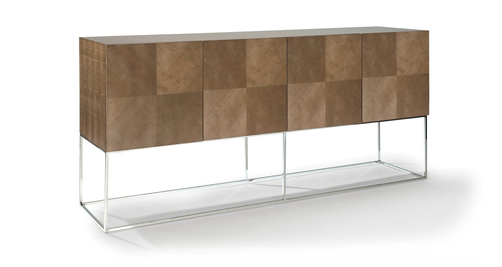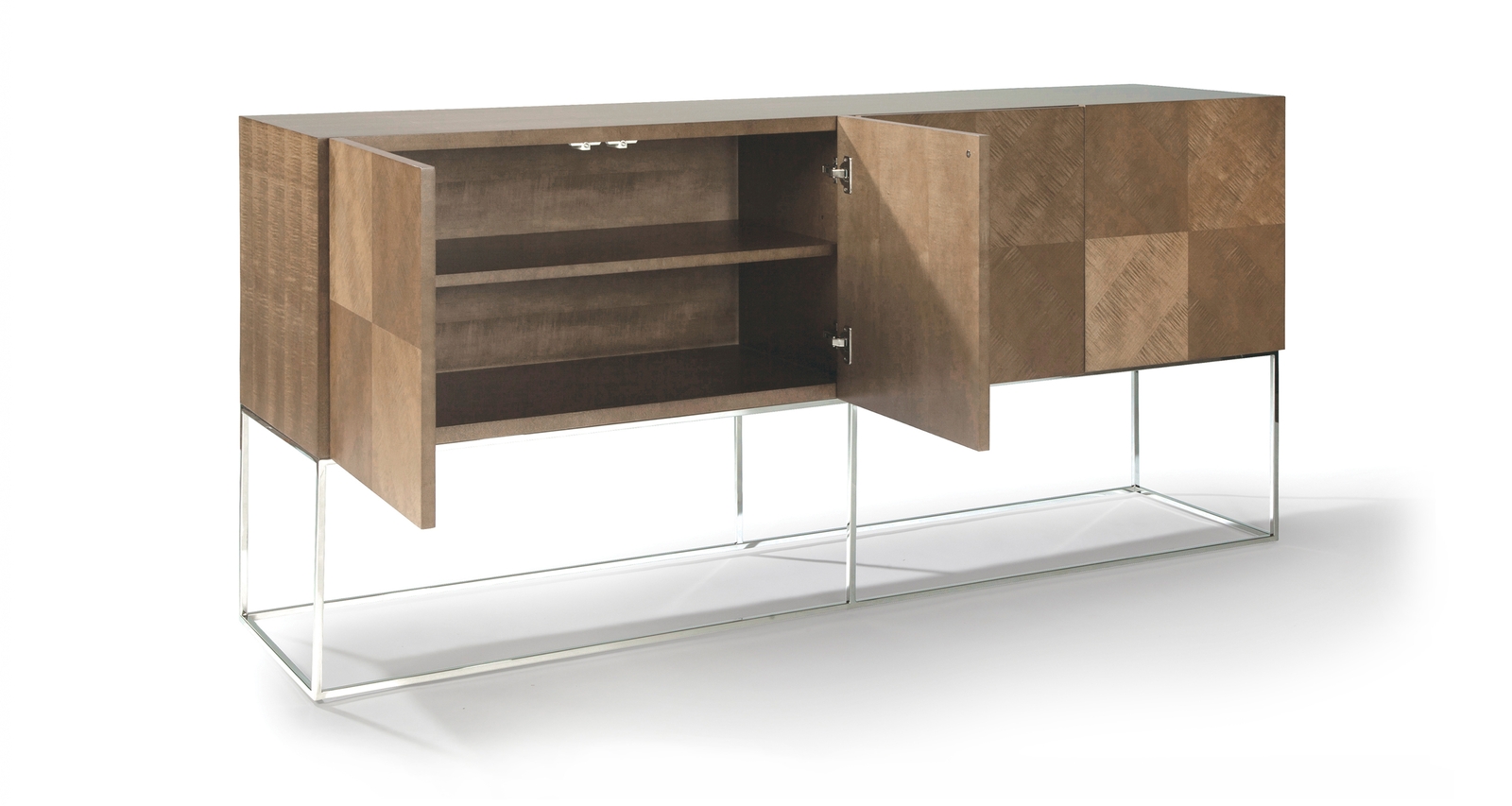 Our Mabel Maple is a timeless modern classic. The versatile Mabel Maple sideboard features a quartered figured maple top and sides with reverse diamond quarter figured maple doors. Mabel Maple is available in any TC wood finish on maple. Polished stainless steel legs are standard. Also available with acrylic sides as No. 1352-47 or as a hanging unit as No. 1350-46.