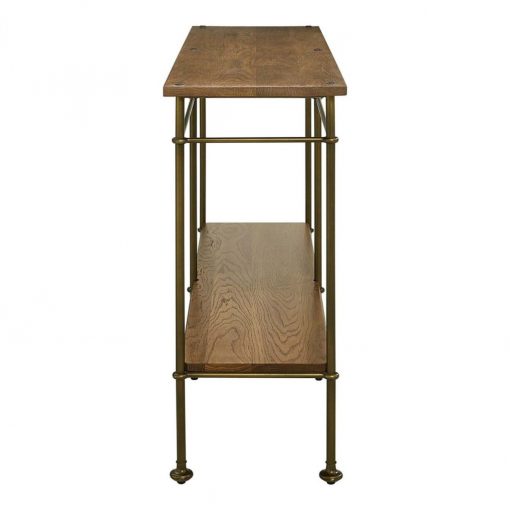 Mixed materials add contemporary style to the simple, clean St. Lawrence Metal Console Table and End Table. For both pieces, a solid oak top rests upon round metal legs that intersect its surface at the top and end in turned feet below. Horizontal stretchers on all sides and a solid wood fixed shelf add stability and create open storage space.