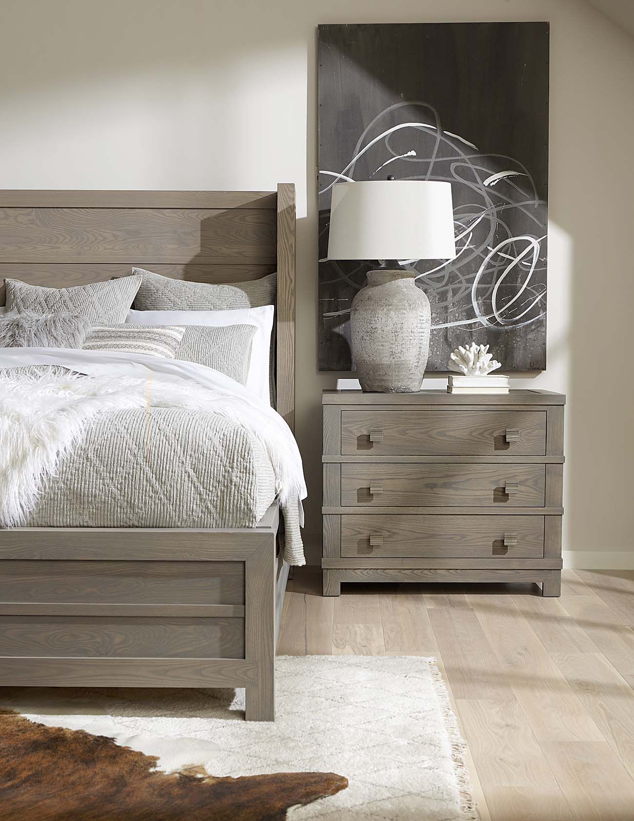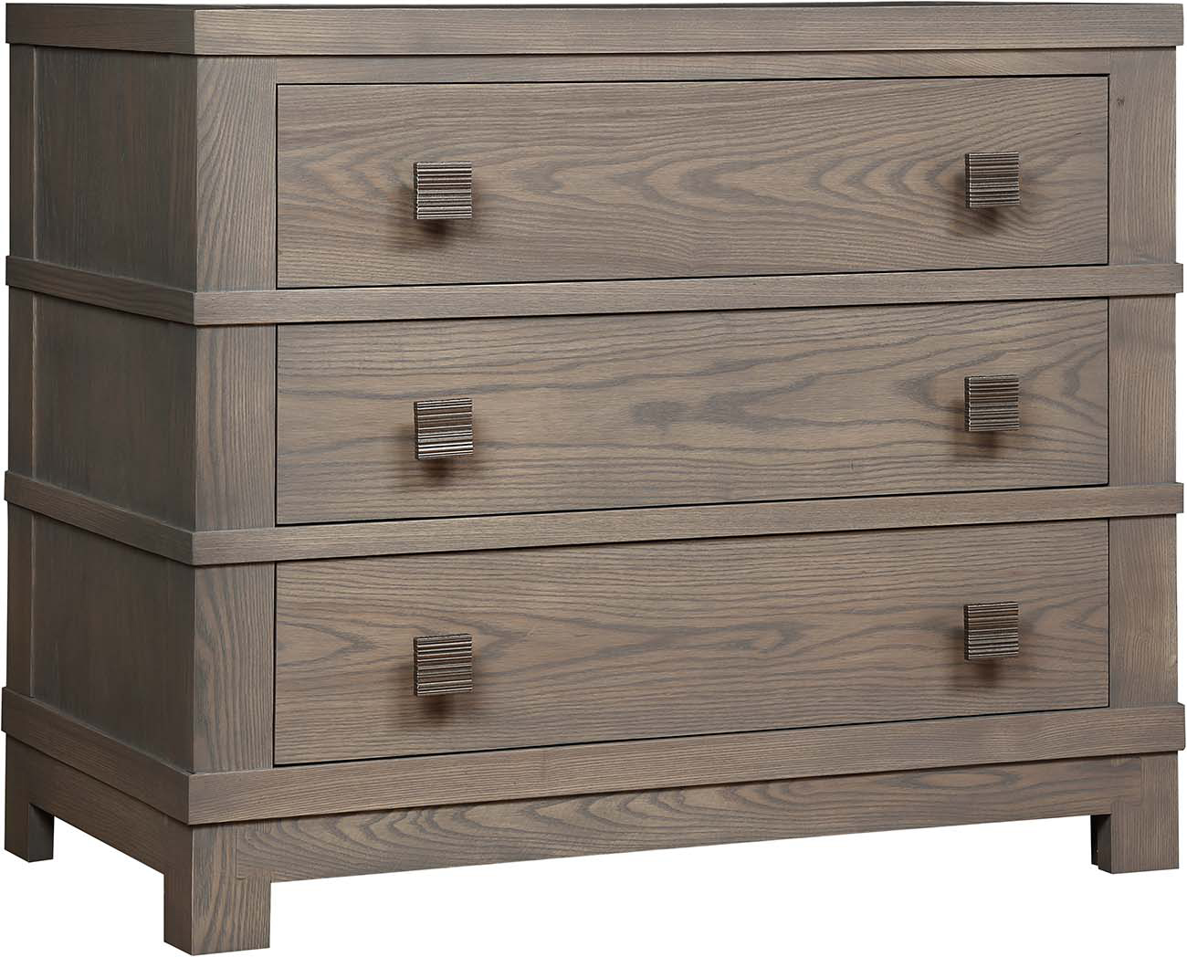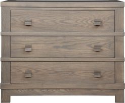 Three side-hung, center-guided dovetail drawers adorned with square dark pewter knobs are topped with an expansive surface perfectly sized for housing bedside necessities. The clean lines and horizontal side panels give the piece a contemporary sophistication, and the block feet mimic the base of the Ashwood Bed. Traditional Stickley construction is evident with mortise-and-tenon joinery and dovetail bottom rails. Choose from Tidewater or Flax finish.