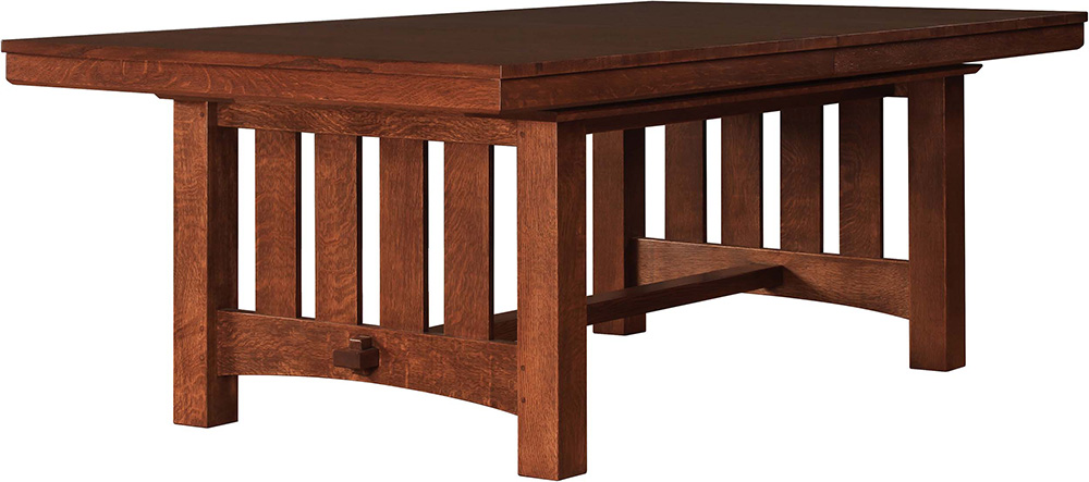 An impressive example of Mission style, the Grande Trestle Table is made of solid oak with beautiful grain displayed on every surface. Classic Stickley joinery, including pinned mortise-and-tenon joints and large, keyed through-tenons at each end of the stretcher, give it stability that will last. The top conceals two 20-inch leaves that expand the table to 124 inches for family gatherings.