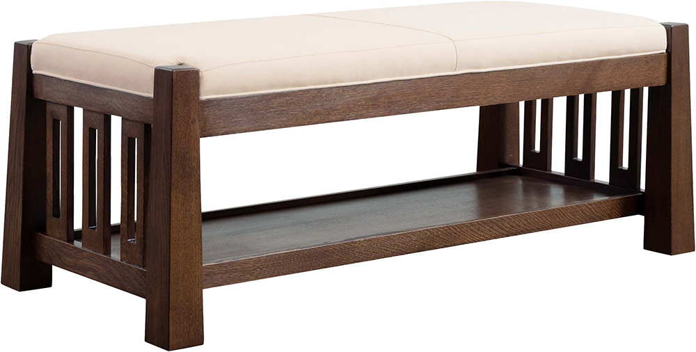 The Highlands Bench provides extra seating whether it be by a roaring fire or in a sunny entrance hall. Tapered posts and pierced slats speak to the Mission look, while the upholstery exemplifies the highest standards of craftsmanship. Available in solid oak or cherry.