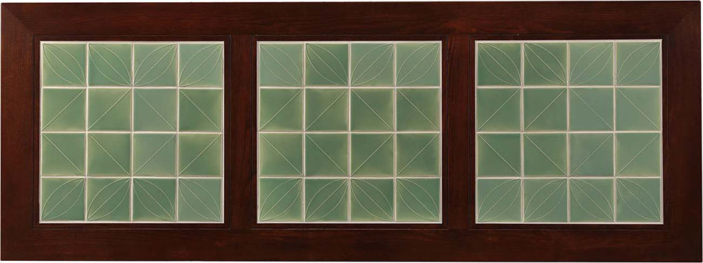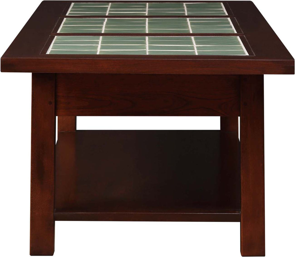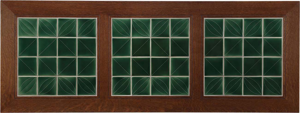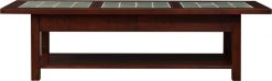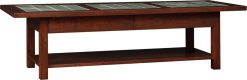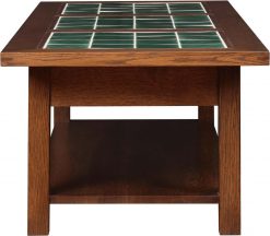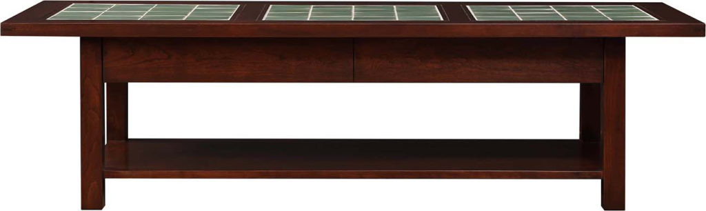 The expansive surface of this cocktail table comes to life with three inset mosaics featuring hand-carved tiles by North Prairie Tileworks. Two side-hung, center-guided drawers and pinned mortise-and-tenon joinery make this piece as strong and functional as it is beautiful; a lower shelf offers additional storage space. Solid cherry or oak.