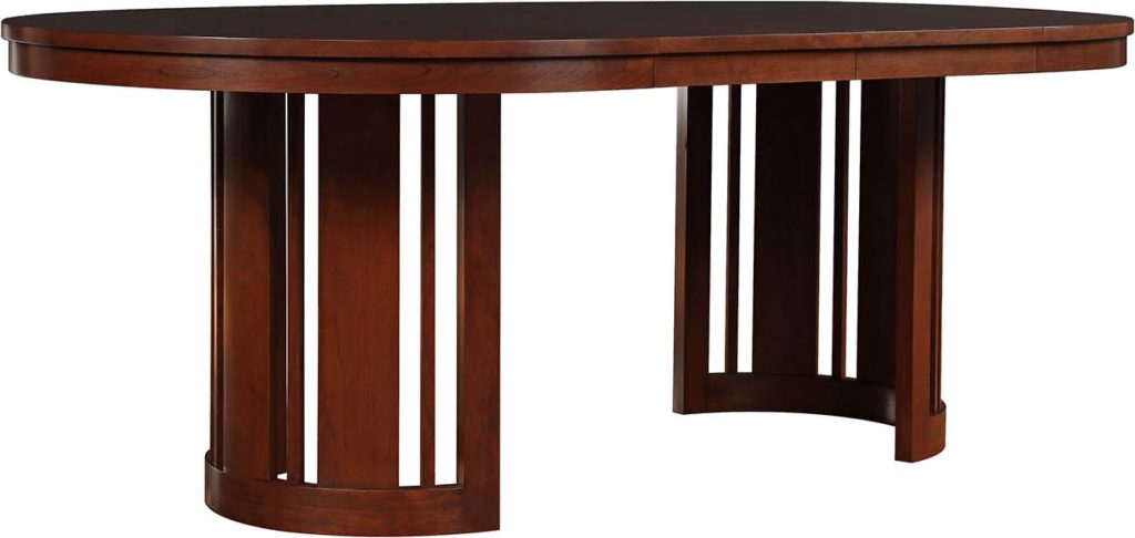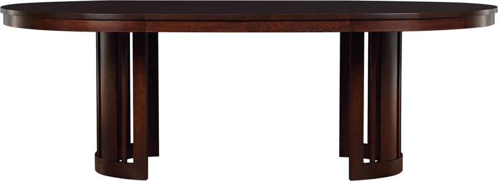 This beguiling table carves out a strong identity by alternating spindles with wider slats, creating a dynamic look and bringing lightness to the form. For flexibility in entertaining, the drum base and tabletop part at the middle to accommodate two 16-inch leaves.