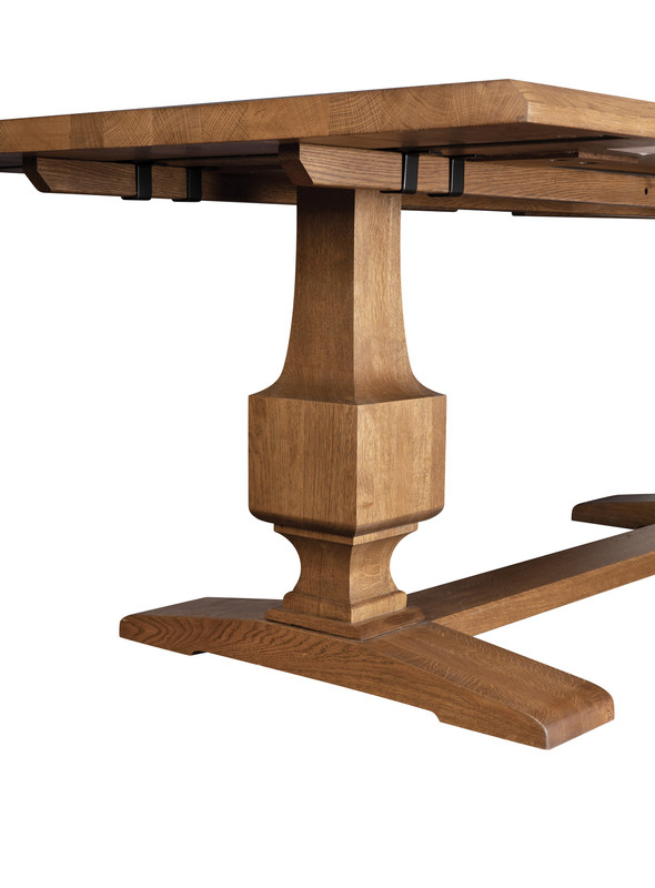 A contemporary approach to Stickley’s old-world craftsmanship can be seen in the St. Lawrence Trestle Dining Table, an inviting place where family memories are created. Its beautiful fixed double pedestal is carved to form deep, squared-off bands and layers. Above, the textural grain of solid oak—wire-brushed and finished in Bay Brown—gives the clean, beveled tabletop its easy-going elegance; pull-out extenders accommodate two 18-inch leaves to expand the table to 124 inches.