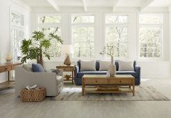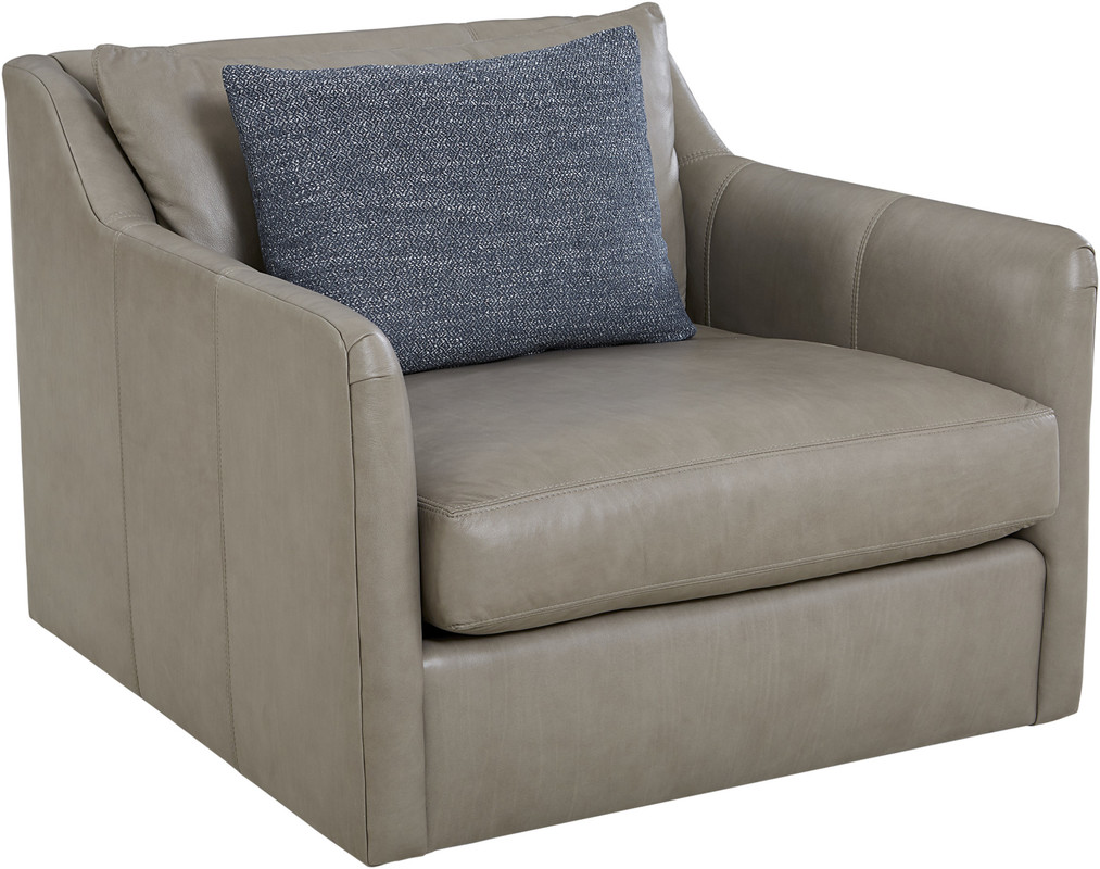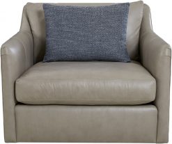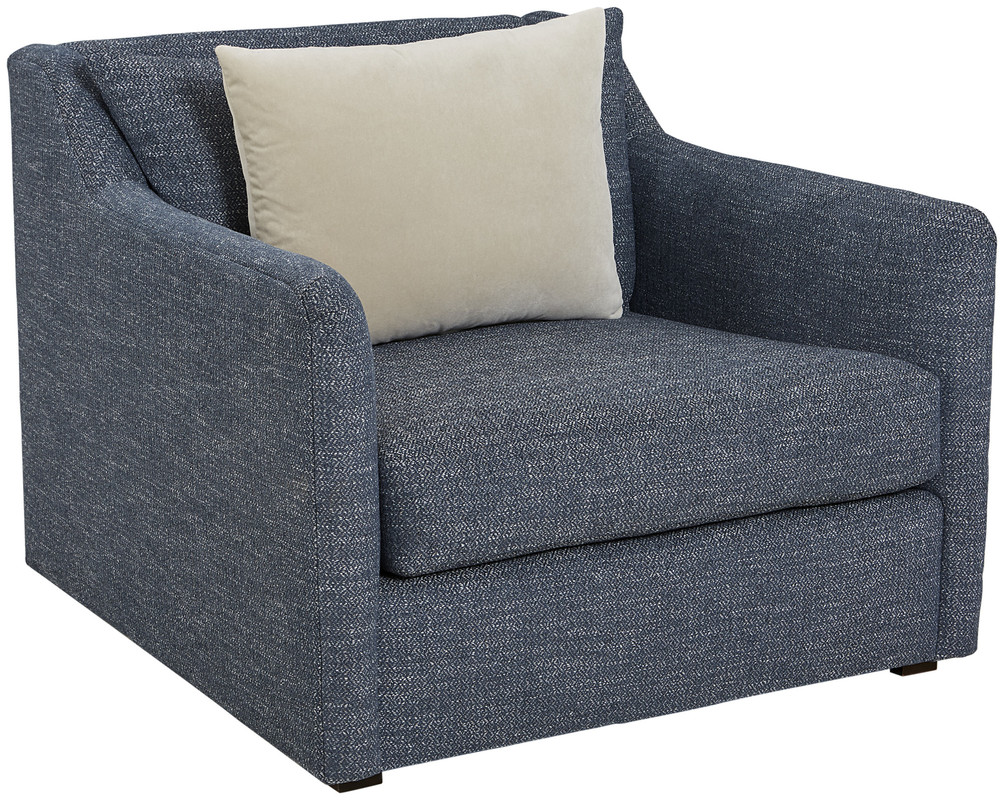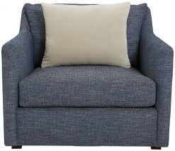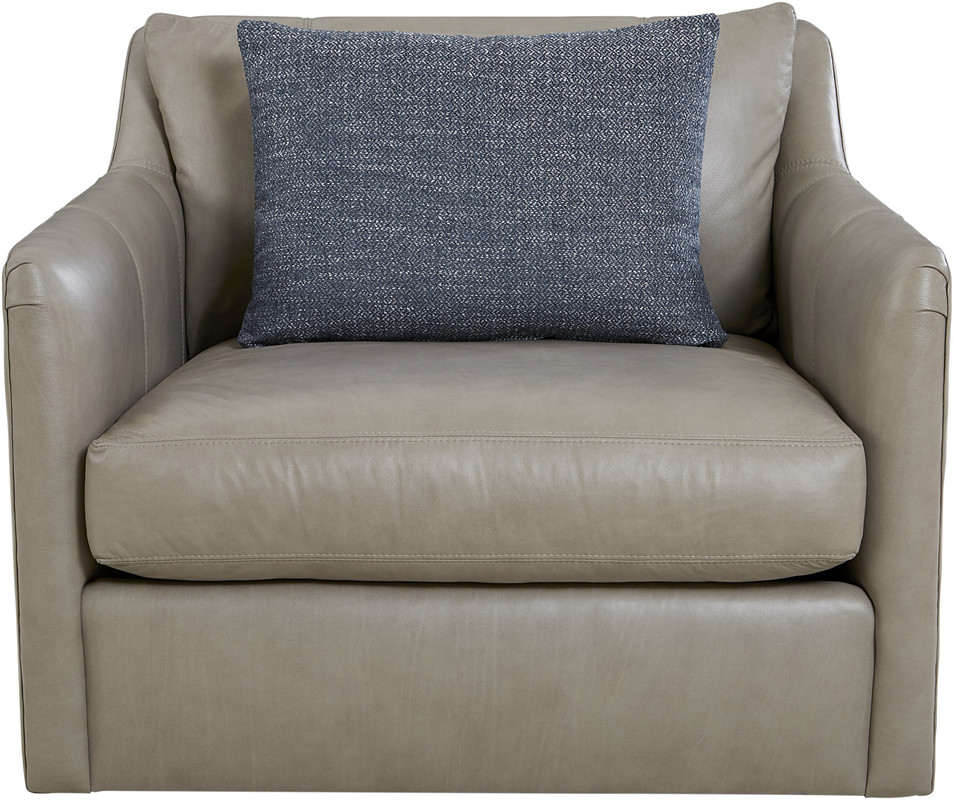 The remarkably comfortable Tibbett Chair is also a jewel of transitional design. Its wide, low-profile frame of narrow arms and wings creates a clean, stylish look. Nestled within are a broad, loose seat cushion and a knife-edge back pillow and kidney pillow, all deep, plush, and welcoming. Add motion to the experience with a swivel-chair option.