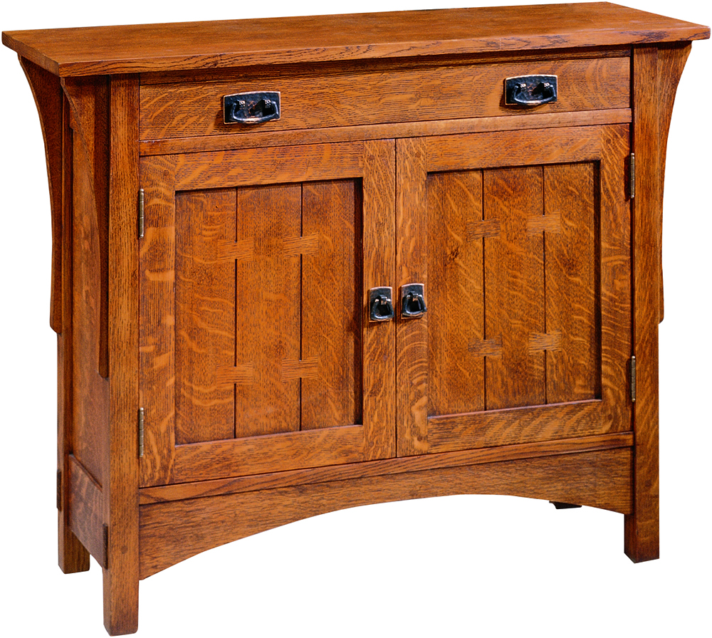 A practical and beautiful console with butterfly joinery on the doors that conceal one adjustable interior shelf. Dark copper hardware on oak and cherry knobs on cherry version. Available in solid oak or cherry.