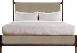 Flowing lines inspired by modern design create a contoured statement piece for your bedroom. On this elegant bed, an offset frame gives the solid headboard the illusion of draped fabric, while rich walnut rails and upholstery continue around all sides of its base. Soft brass ferrules are a subtle finishing touch. Available in fabric or leather.