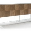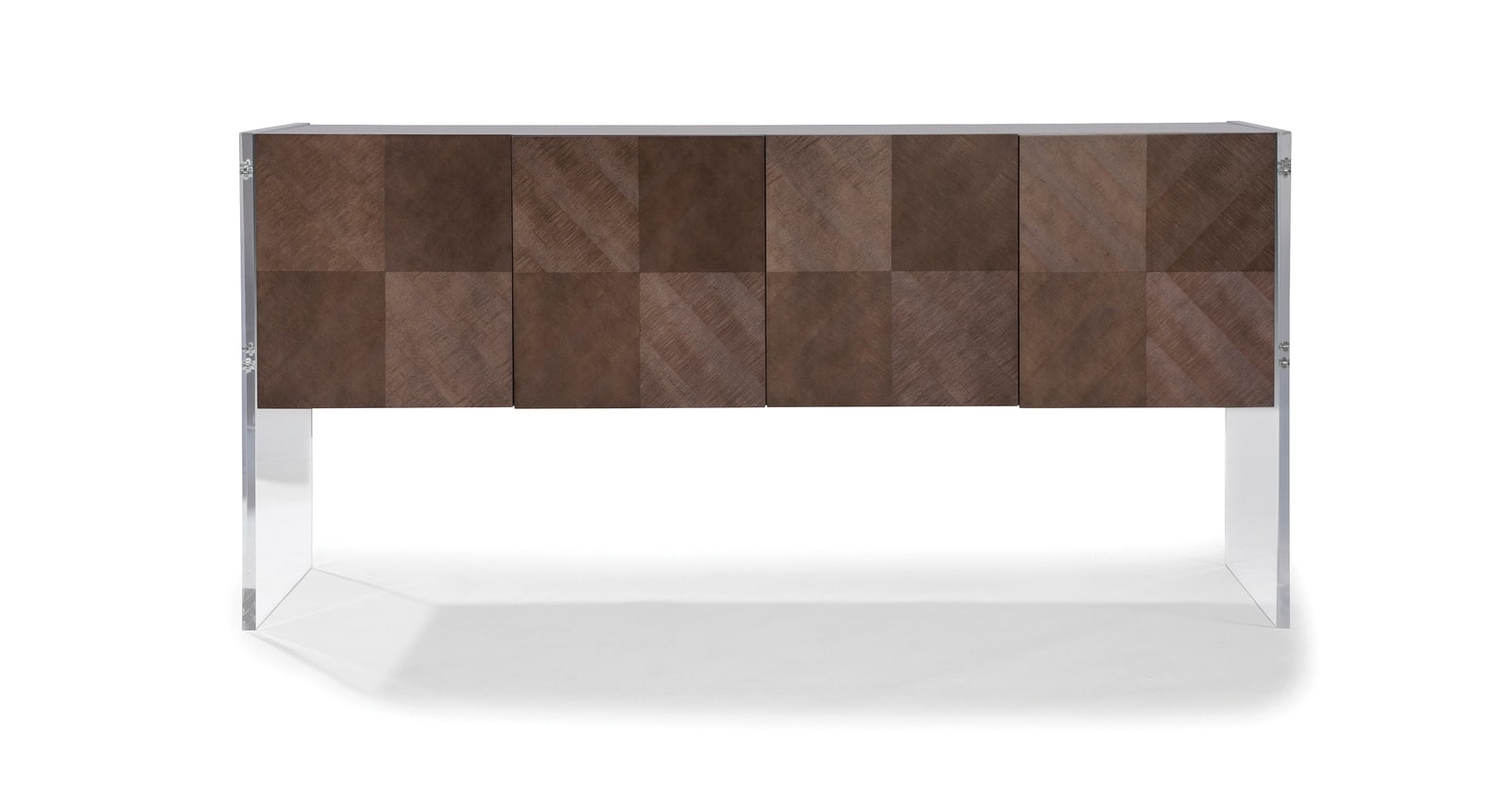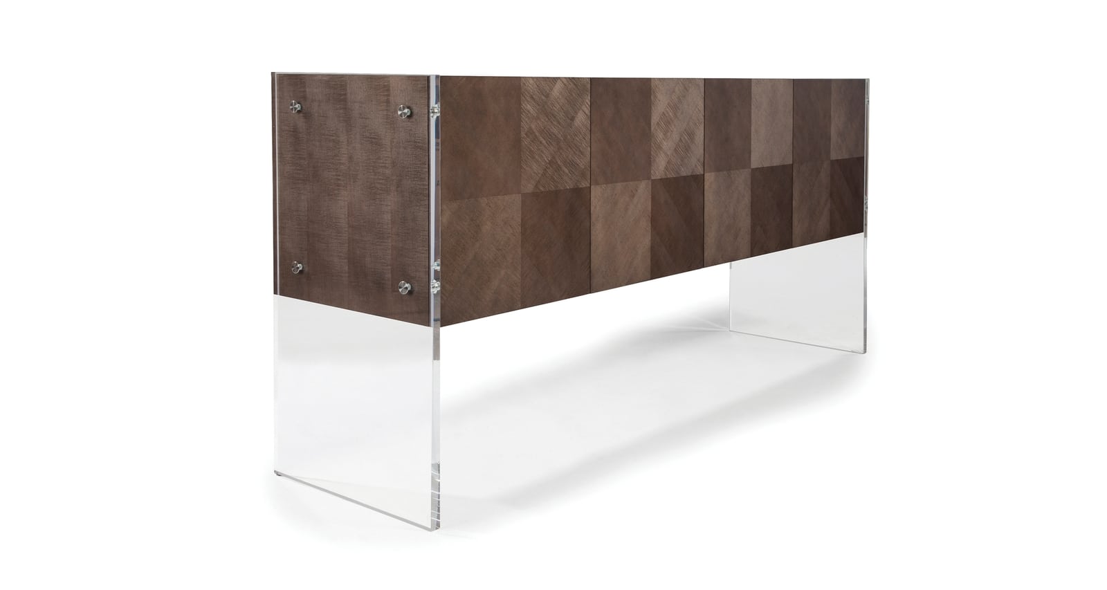 Our Swanky credenza is a timeless modern classic. The versatile Swanky sideboard features a quartered figured maple top and sides with reverse diamond quarter figured maple doors. Swanky is available in any TC wood finish on maple. One inch thick clear acrylic legs are standard. Decorative metal discs are available in brushed stainless, brushed bronze or satin brass. Also available with a polished stainless steel base as No. 1349-47 or as a hanging unit as No. 1349-46.