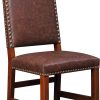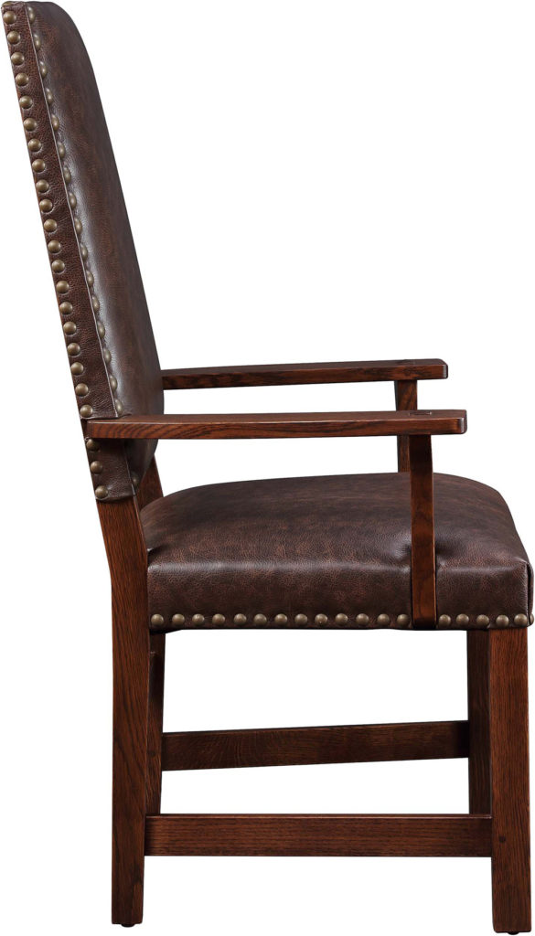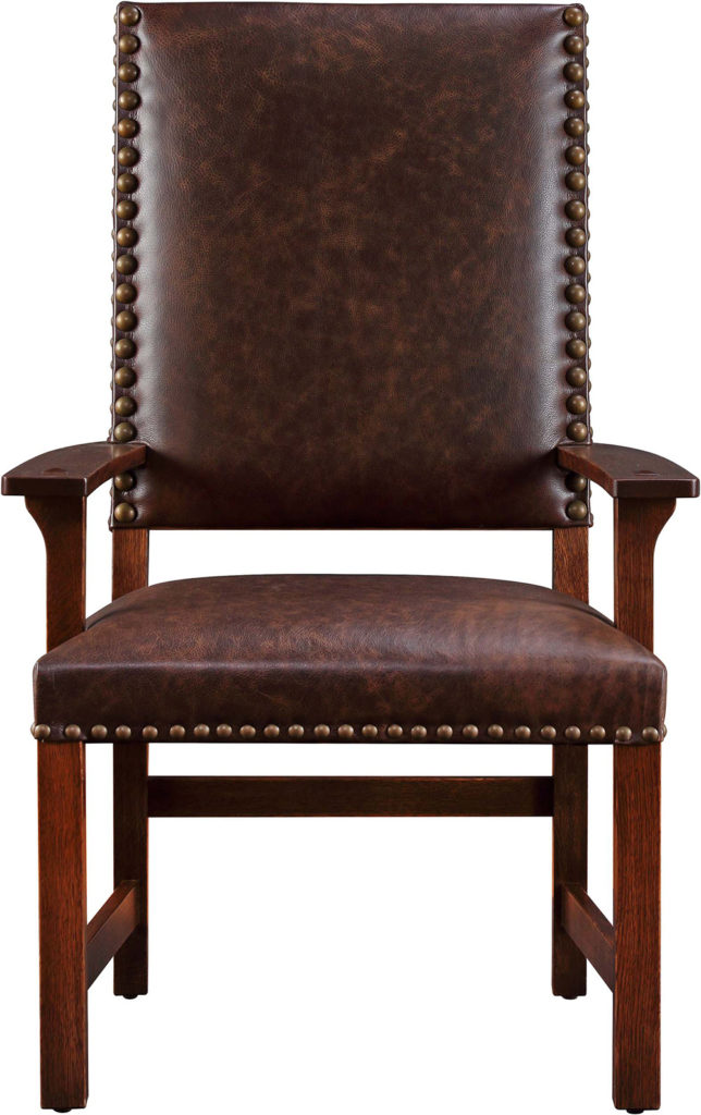 Perfect in combination with any Mission dining room, our Tall Back Upholstered Chairs are skillfully crafted from solid oak. The stately high back is finished with one-inch brass nailhead trim, with smaller nailhead trim around the seat. Available in any Stickley fabric or leather.